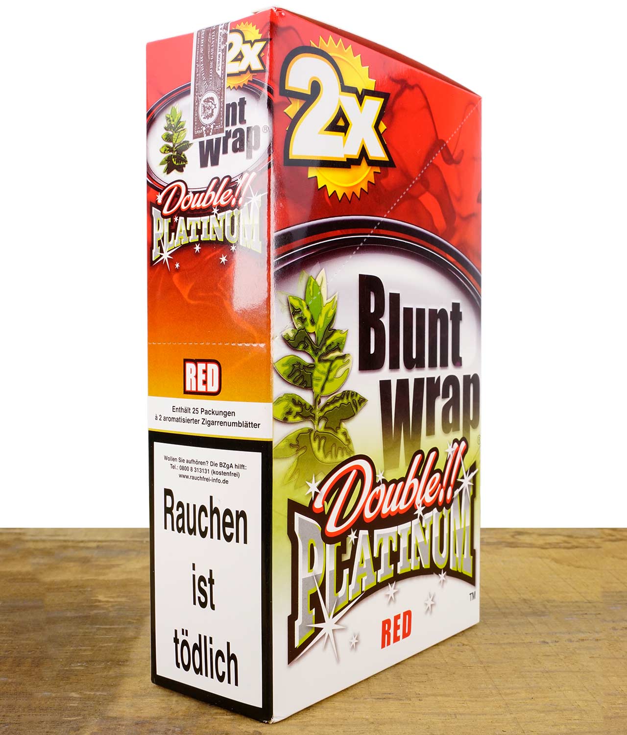 Die Blunt Wraps von Double Platinum sind aromatisierte Tabak-Wraps die es in vielen verschiedenen Geschmacksrichtungen gibt. Der Tabak stammt aus der traditionsreichen Dominikanischen Rpublik. Die Wraps kommen immer im luftdicht verschlossenen 2er Pack. Um Knicke und Brüche zu vermeiden, sind die Wraps um einen Strohhalm gewickelt, welcher auch im Nachhinein als Stopf- und Füllhilfe nützlich sein kann. Durch die bestehende Restfeuchtigkeit im Produkt lassen sich die Blunt-Wraps beim Drehen gut handlen. Das 25er Pack enthält 25x2er Packungen (50 Wraps).