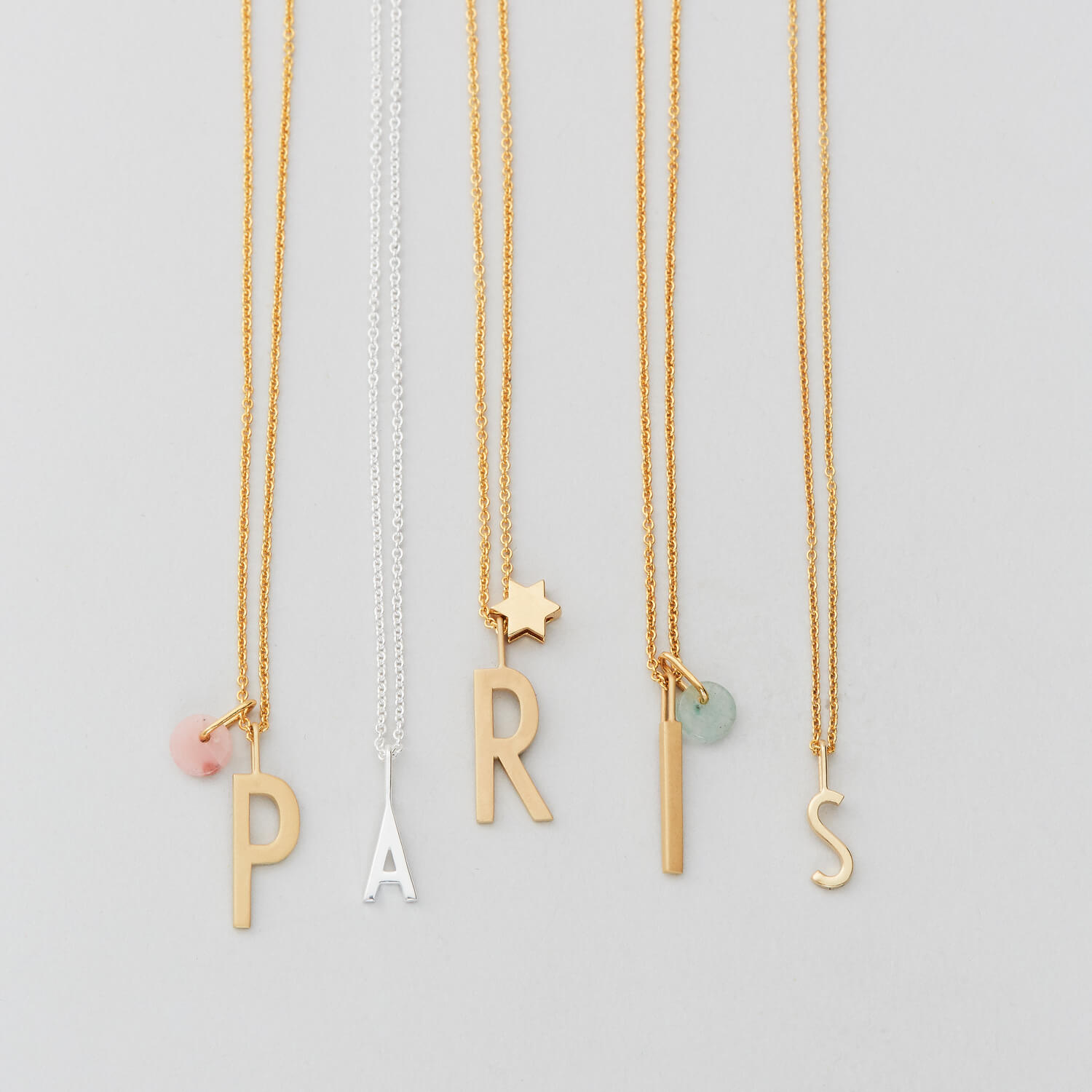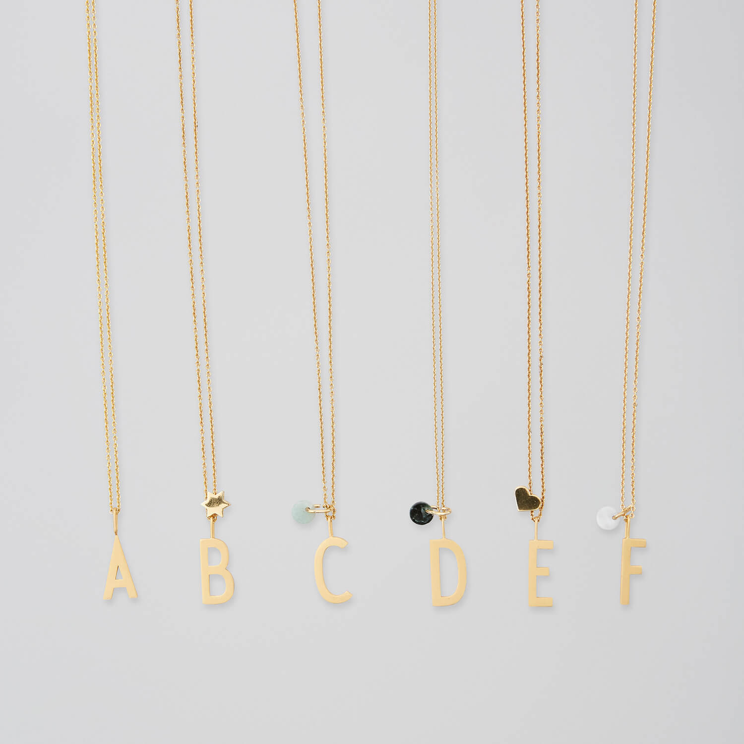 Die Typografie für die Buchstabenanhänger wurde ursprünglich 1937 vom weltbekannten dänischen Architekten Arne Jacobsen handgezeichnet. Die Buchstabenanhänger sind in zwei Größen und 18 k (Karat), ein vergoldetes Sterlingsilber, erhältlich. Die Oberfläche ist matt und jeder einzelne Anhänger ist handpoliert für ein perfektes Finish. Für jeden Look oder Stimmung kannst du weitere Buchstaben oder kleine niedliche Anhänger wie Herzen, Sterne oder Opale hinzufügen und deine Kette einzigartig machen!