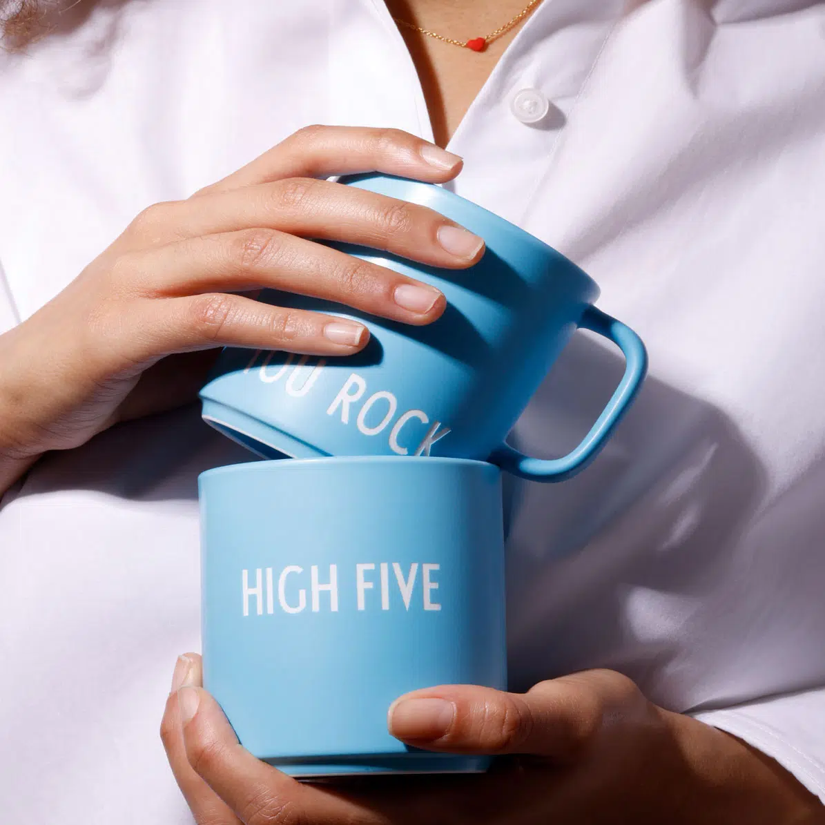 Einfach mal Abklatschen! Mit diesem schicken Becher wird die Geste zum Statement. Die satte Farbe zieht den Blick außerdem magisch an und ist ein grandioser Farbtupfer, ob auf dem Schreibtisch, am Esstisch oder im Regal.