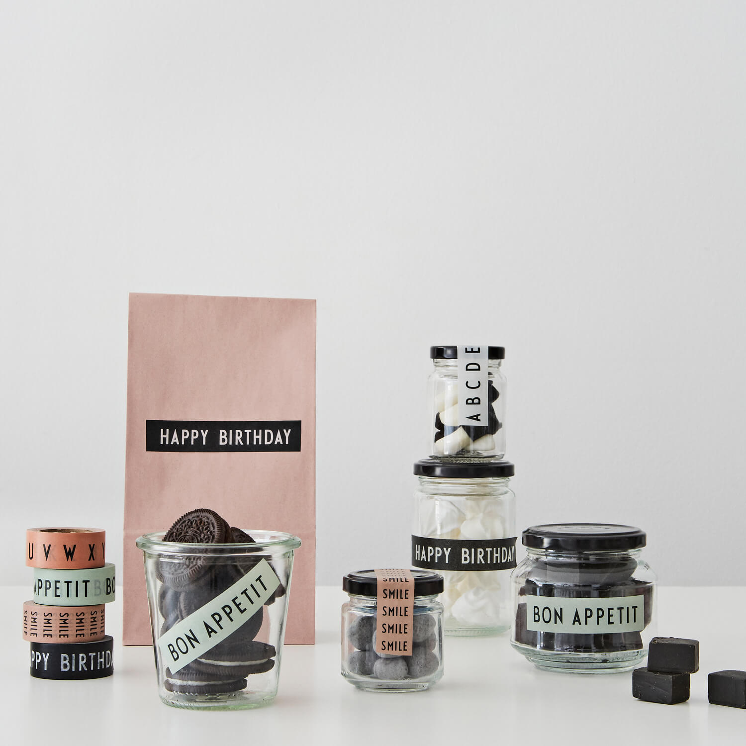 Sag es mit Klebeband! Das stilvolle und grafische Design Letters – Masking Tape Bon Appetit ist perfekt für ungewöhnliche Anwendungen wie zum Bekleben eines schönen Geschenkes, als Dekoration auf deiner persönlichen Grußkarte, Sammelalben oder für spezielle Dekoration zu Hause. Das Band basiert auf japanischem Washi Tape und besteht aus Papier. Du erhältst das Tape im praktischen 2er Pack, 1x mit dem Schriftzug „Bon Appetit“ und 1x mit dem Arne Jacobsen Alphabet. Eine Rolle ist 10 m lang.