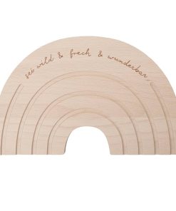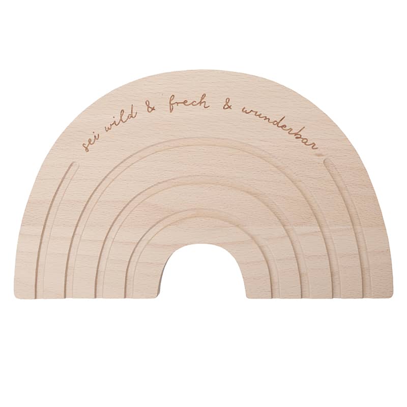 So startet man gut in einen neuen Tag: Das Regenbogen-Frühstücksbrettchen von Eulenschnitt macht das Auftischen am Morgen zum dekorativen Highlight. Die kleinen gefrästen Bögen sind die perfekten Rillen, um dort bunte Snack-Schnipsel wie Karotten oder auch Blaubeeren zu legen. So zaubert man im Nu einen wunderschönen – und vor allem essbaren! – Regenbogen. Der Spruch „sei wild & frech & wunderbar“ verleiht dem Brettchen eine zusätzliche Stil-Note.