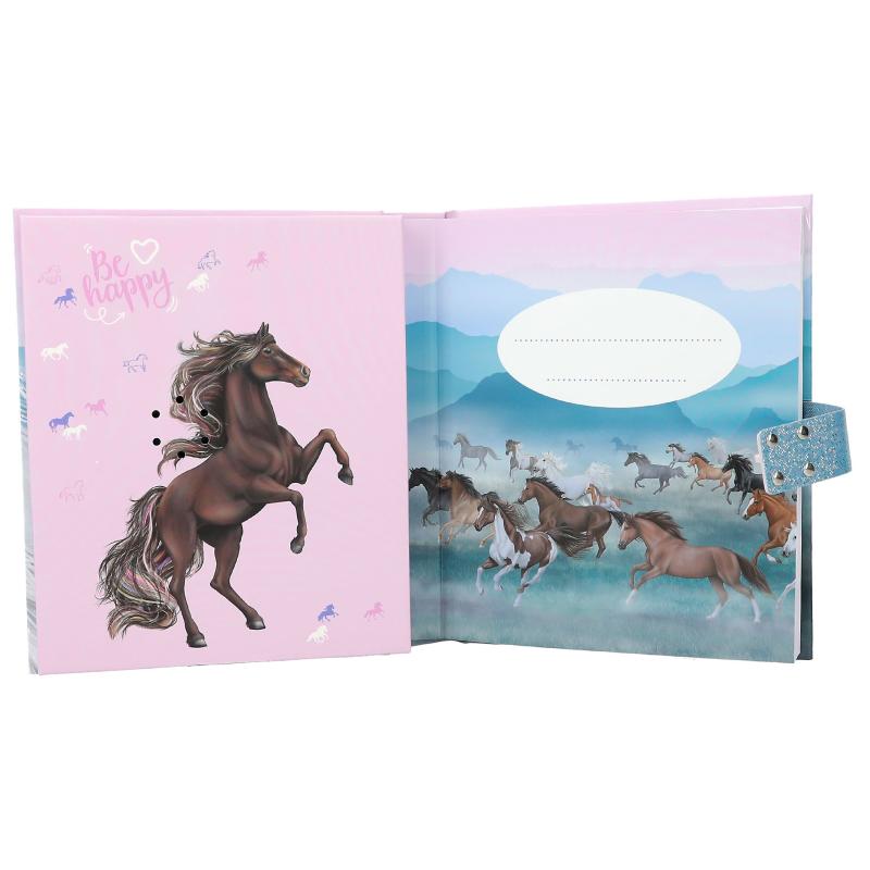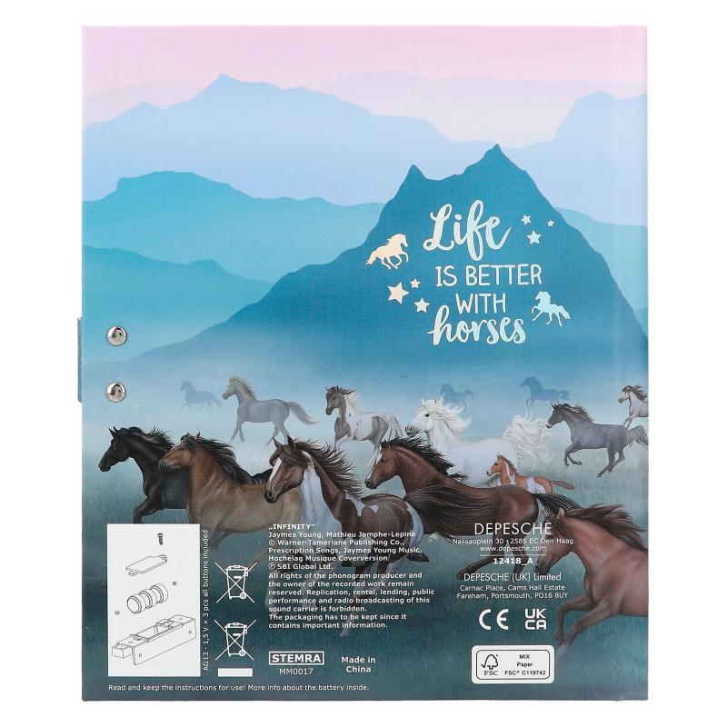 In diesem Tagebuch von Depesche sind alle Geheimnisse und Gedanken sicher – denn lesen kann es nur, wer den entsprechenden Code kennt. Tippt man den selbst gewählten vierstelligen PIN ein, öffnet sich das Schloss und der Top-Hit „Infinity“ erklingt für rund 20 Sekunden. Im Inneren befinden sich 80 linierte, bunt illustrierte Seiten zum Ausfüllen.
