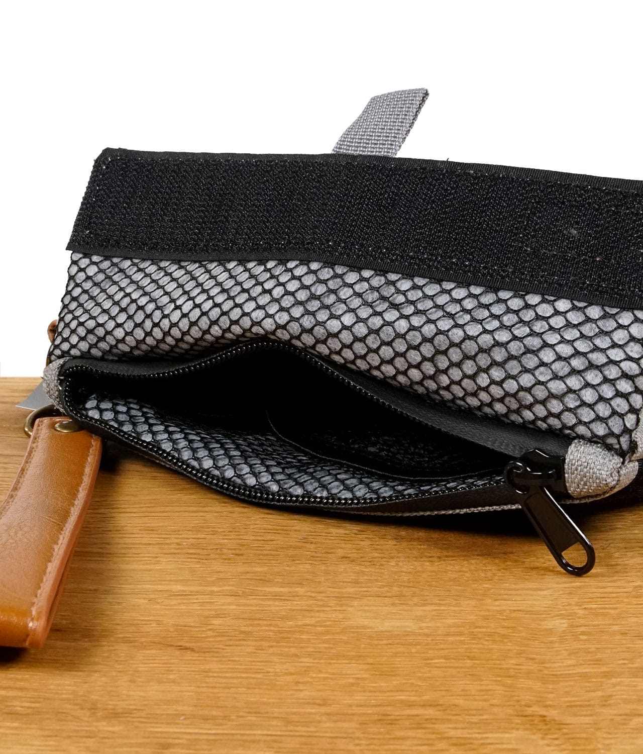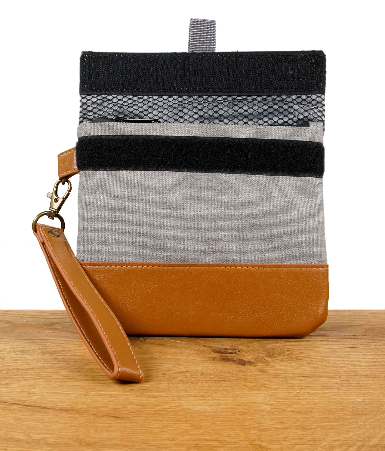 Stilvoll & Praktisch: Das vegane Leder in Braun verleiht dem Beutel einen edlen Look, während der Clip für einfaches Tragen sorgt
