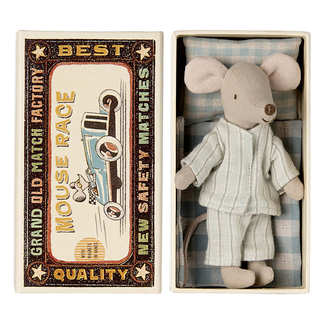 Dieses Familienmitglied der Matchbox-Mäuse-Familie von Maileg macht es sich nach dem Spielen gerne in einem kleinen Streichholz-Schächtelchen gemütlich. Dabei hat jede Maus natürlich ihren ganz eigenen Rückzugsort – Bruder und Schwester schlummern jeweils in einer Box mit Rennauto-Aufdruck. Maileg setzt bei der Produktion der Kuschelmäuse auf hochwertige Baumwolle, was wiederum für ein angenehmes Gefühl beim Spielen sorgt.