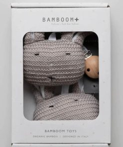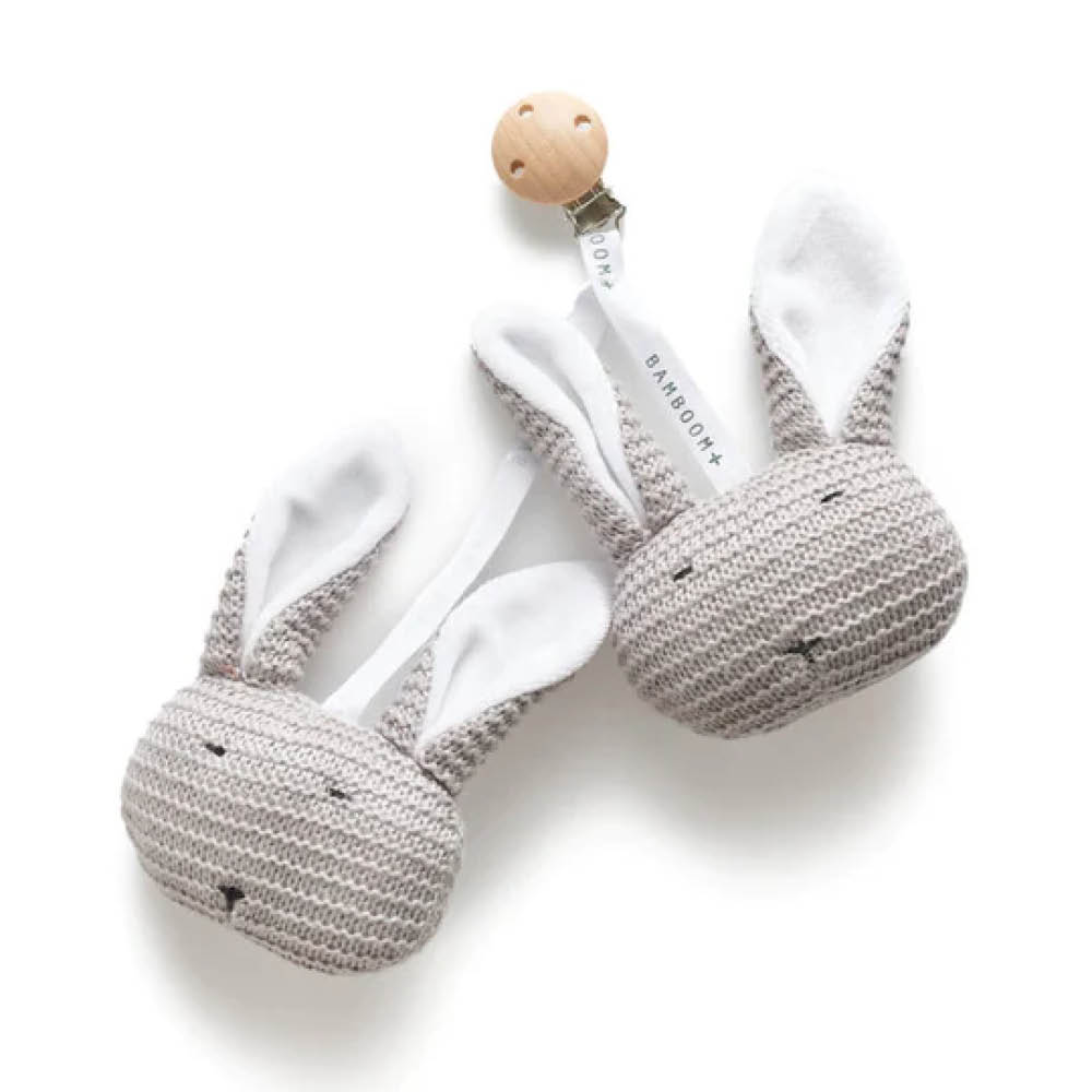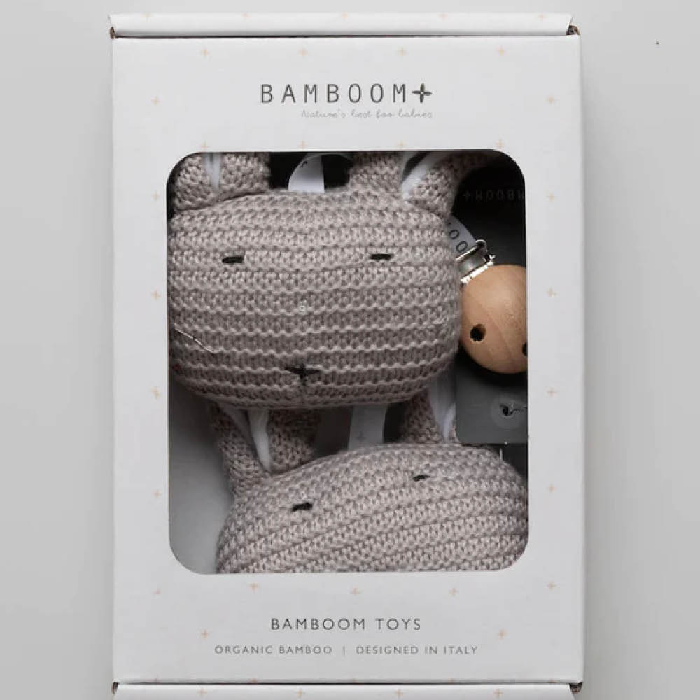 Dieses schnuckelige Babyspielzeug von Bamboom in Hasenform hält die Kleinen beschäftigt. Die flauschigen Häschen wissen durch ihre schöne Strickoptik zu überzeugen und bestehen zu 100% aus Bambusviskose. Für die Befestigung der Hasen sorgt ein hochwertiger Holzclip.