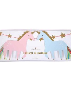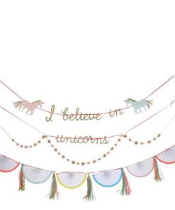 Ideal für Einhorn-Mottopartys und andere fabelhafte feierliche Anlässe: Diese Girlande von Meri Meri sorgt für zauberhafte Atmosphäre! Die bunten Farben und Einhörner sowie der hübsch inszenierte Spruch „I Believe In Unicorns“ und viel, viel Glitzer hellen jeden Raum auf.