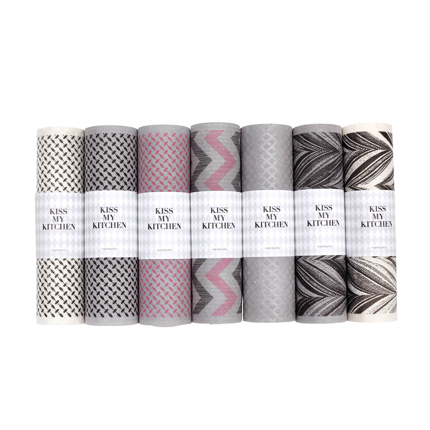 Wir sind ganz und gar von der Rolle! Die KMK Schwammtuch-Rolle Pali Schwarz-Grau besteht aus 12 einzelnen Schwammtüchern und zum einfachen Abreißen ist jedes Tuch praktisch perforiert. Beim Hamburger Label KISS MY KITCHEN dreht sich alles um Style und Nachhaltigkeit. Die skandinavisch angehauchten Grafiken und Mustermixe sehen einfach nur klasse aus. Auch bekommt das Wort „Mehrweg“ mit jedem einzelnen der 12 wiederverwendbaren Schwammtücher eine völlig neue Bedeutung. Die einzelnen Tücher sind waschbar, kompostierbar und somit nachhaltig. Die Schwammtuch-Rolle Pali Pur wird in Deutschland produziert und im gleichen Betrieb veredelt. Durch die besonderen Farbkombinationen und die stylischen Muster auf diesen Schwammtüchern werden aus Alltagsgegenständen ziemlich beste Accessoires für Küche & Co. Der Materialmix besteht aus 70% Cellulose und 30 % Baumwolle.
