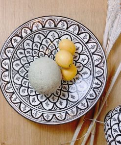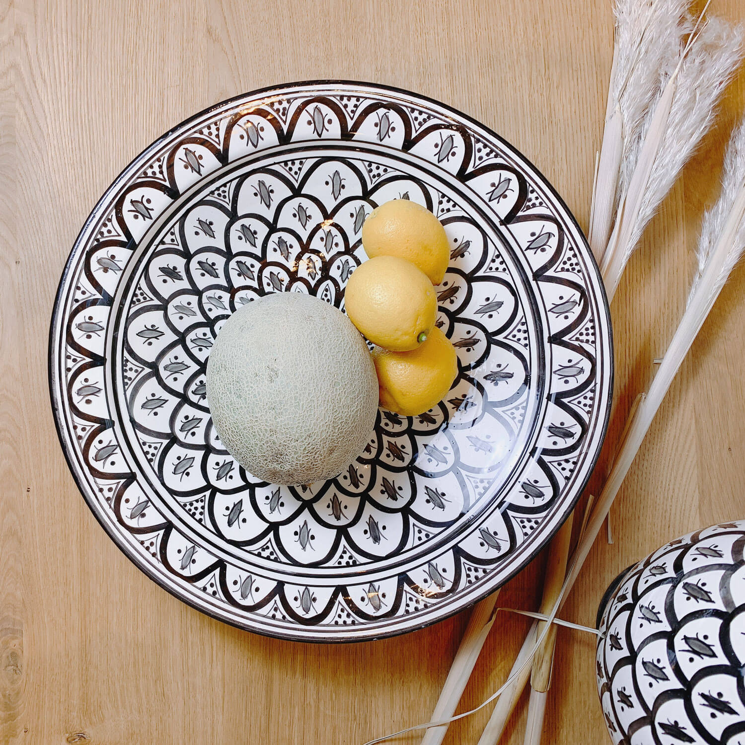 Unser Marokkanischer Teller Peacock Schwarz Weiß mit dem lieb gewonnenen, traditionell marokkanischen Pfauenmuster hat einen Durchmesser von ca. 40 cm und ist ca. 8cm hoch. Das herrliche Muster ist von Hand aufgemalt und glasiert. Der elegante und kontrastreiche Look sorgt in jedem Fall für Aufsehen und bereichert jedes Ambiente, egal ob modern und klar, klassisch oder scandi. Der Teller eignet sich wunderbar als orientalische Servierplatte aus Keramik. Er kann aber ebenso für Obst und zum Dekorieren genutzt werden.