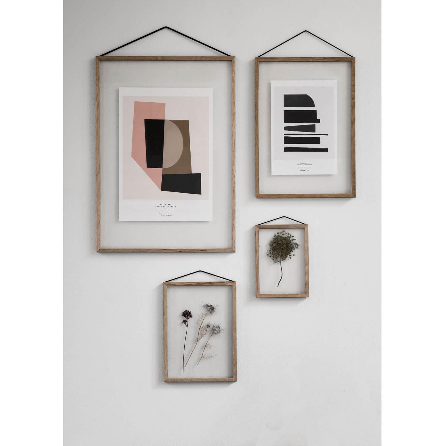 Mit seinem Maß ist der Moebe Bilderrahmen aus Eiche etwas kleiner als DIN A2. Da auf eine klassische Rückwand verzichtet wurde, wirkt die Gesamterscheinung luftig-leicht und transparent. Nutzt man kleinere Drucke oder Fotos, so scheinen diese darin zu schweben und von einem durchsichtigen Passepartout umgeben zu sein. Auch getrocknete Blumen, Selbstgemaltes und Postkarten finden zwischen den Scheiben einen Platz und können stilvoll in Szene gesetzt werden.