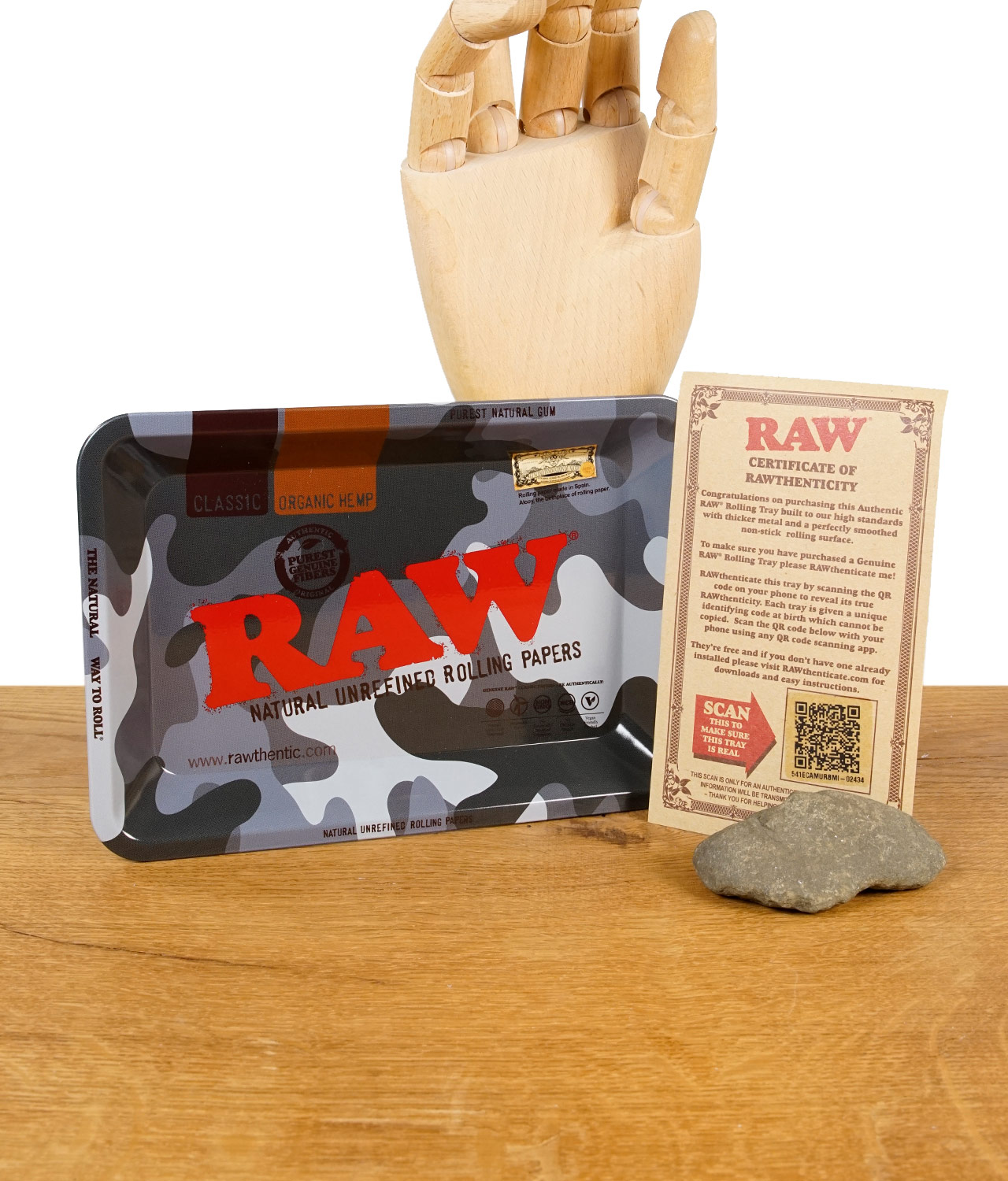 Kompaktes Rolling Tray von RAW im neuen Camouflage Design. Das Tray ist ca. 18 x 12,5cm groß und ist im Vergleich das kleinste Rolling Tray, was RAW zu bieten hat. Durch das graue Camouflage-Design, welches sich über das gesamte Tray zieht, sticht das rote RAW-Logo noch deutlicher hervor. Du möchtest ein größeres Tray? Klick hier!