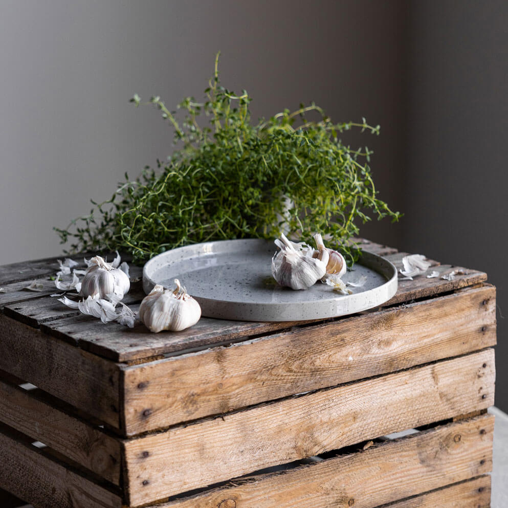 Die gesprenkelte Optik in Naturtönen ist ein Interior-Trend, demnach gibt es ab jetzt auch die beliebte Keramik von der schwedischen Marke Storefactory in dieser Farbe. Die grauen, teils dunklen sandigen Farben versprechen ein cleanes Design und Geradlinigkeit und passen sich spielend deinem Zuhause an, weshalb sich das Tablett ebenso für ruhige Looks wie als Basis eignet, um farbige Highlights zu unterstreichen. Aus diesem Grund ist das Tablett ein richtiges Allroundtalent!