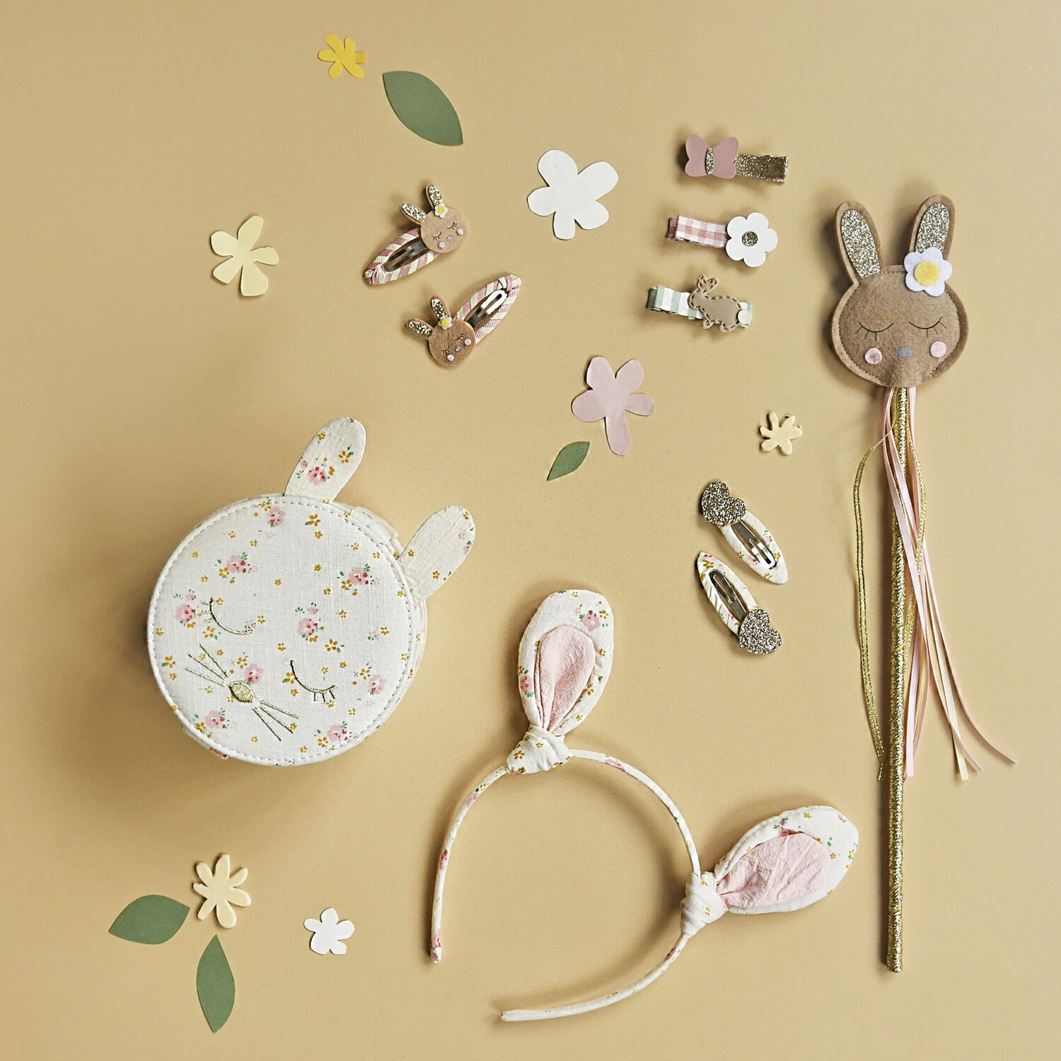 Mit diesem Haarspangen-Set von Rockahula, bestehend aus zwei mit Stoffband umwickelten Haarklammern, fallen die Kleinen besonders modisch auf. Die Haarklammern sind mit süßen Häschen besetzt und nicht nur bei jedem Oster-Outfit ein echter Hingucker!